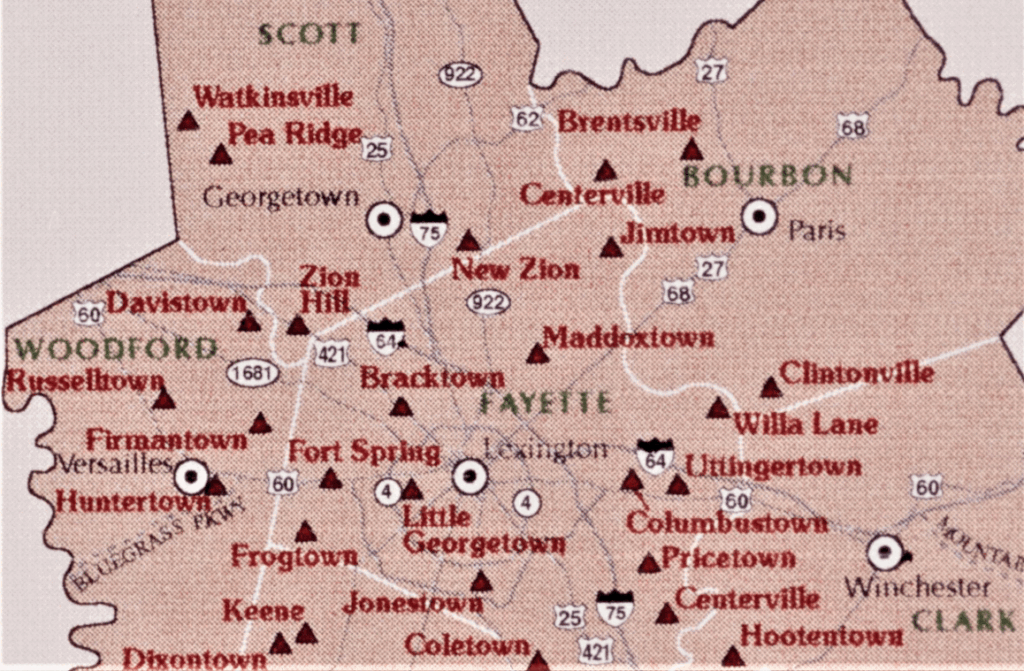 Map of “Black Hamlets of the Inner Bluegrass,” from Karl Raitz Kentucky slides at exploreuk.uky.edu